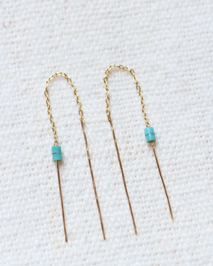 Two long wires connected by a chain. 2 tiny turquoise beads at the end of the chain for a subtle pop of color.