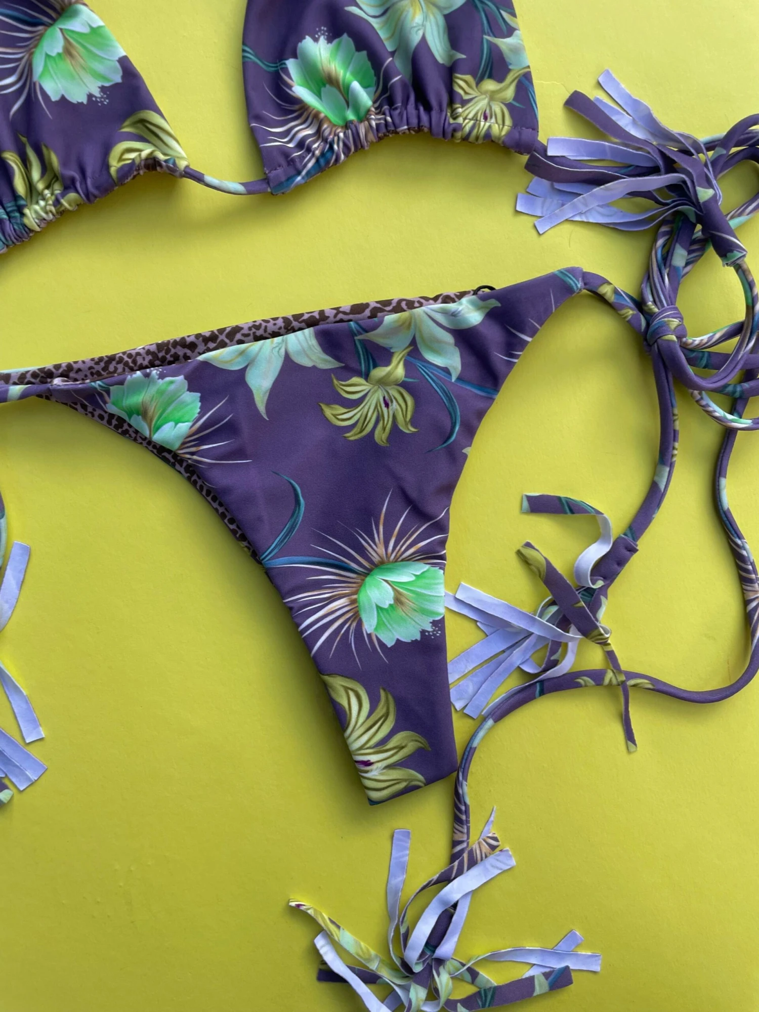 Tie side bottoms with the littlest coverage. Signature Acacia side tassels. Vibrant floral print with muted lavender and electric greens gives off aloha vibes.
