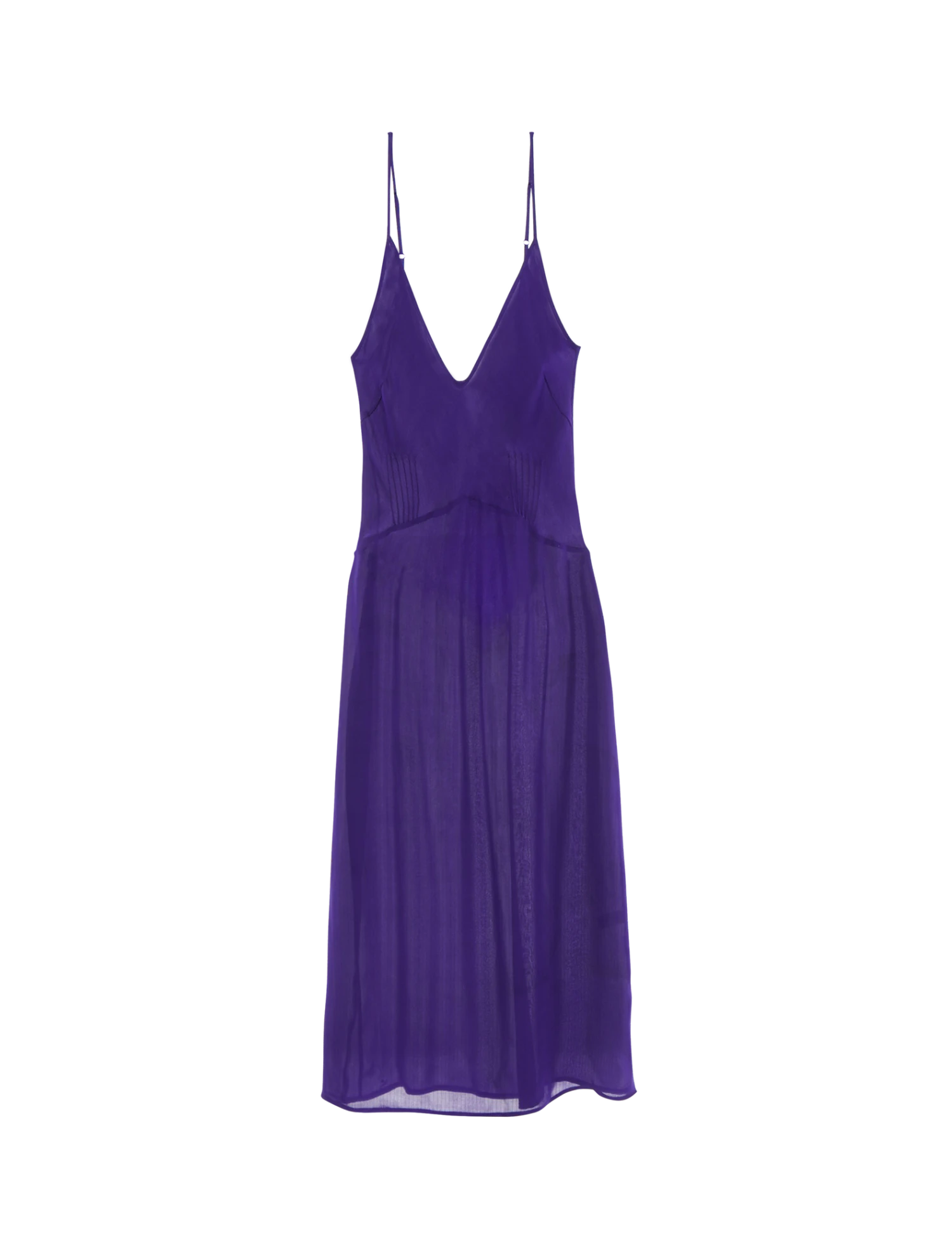 Classic slip in silk georgette with fine pin tucking details that shape the waist and the bust. Plunging neckline shows just the right amount of décolletage.
