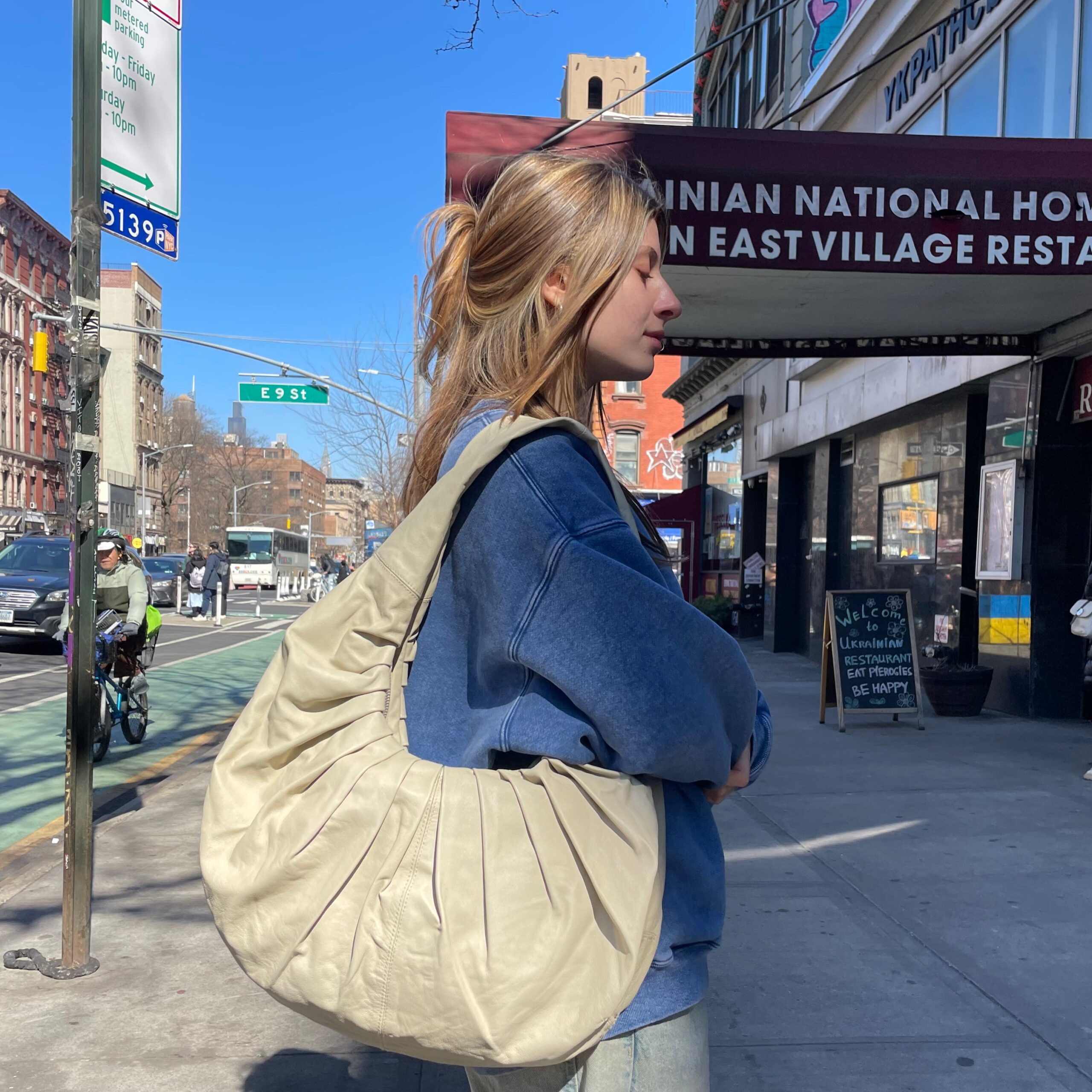 The Miu Bag is a large hobo bag made from genuine leather. Features a comfortable wide strap, center ruching, and zip closure. Interior space suitable to hold a standard 14″ laptop.