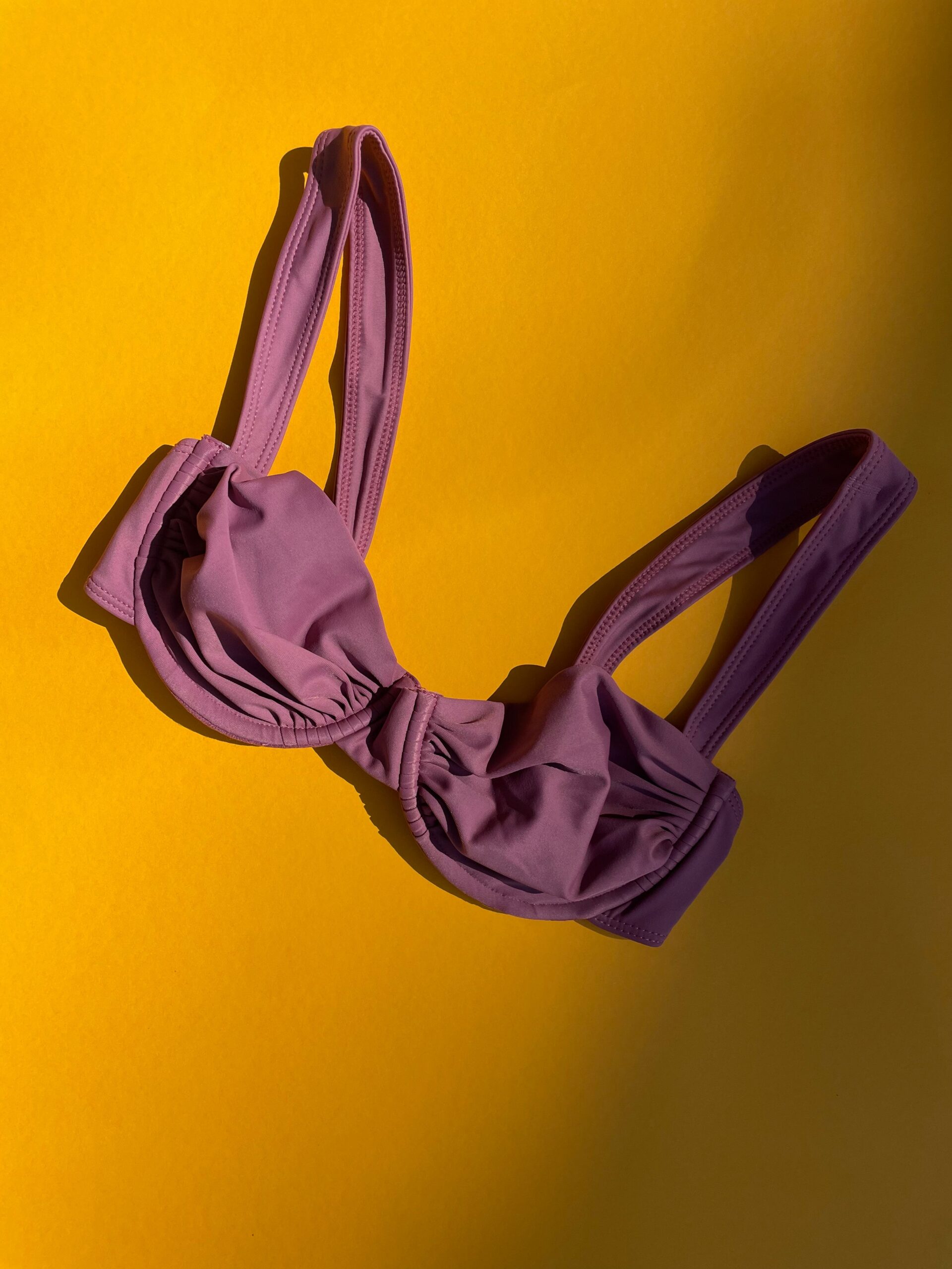 The Oracle Top features a flattering balconette shape, ruched underwire bust, rear clasp fastening, and supportive wide-set straps.
