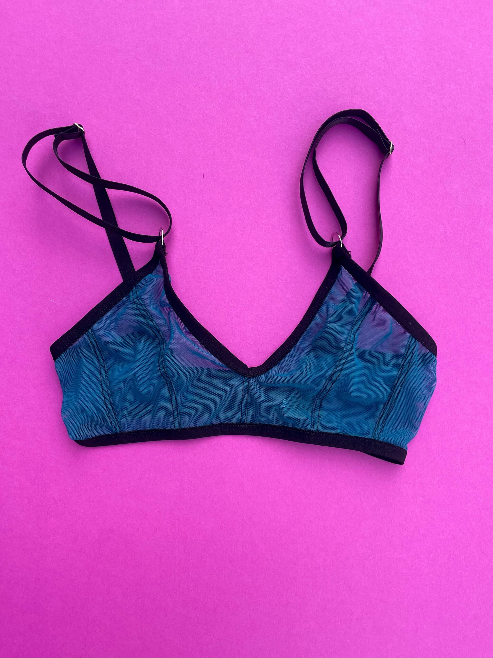 Scoop neck bralette in sheer teal mesh with contrasting elastic black edges and adjustable straps.