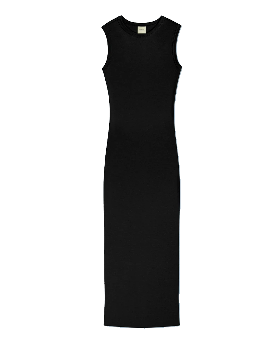 Body skimming, heavyweight cotton maxi dress with muscle sleeves. Cuts below the knee. Round neck and double stitching on the back. Central seam at back.