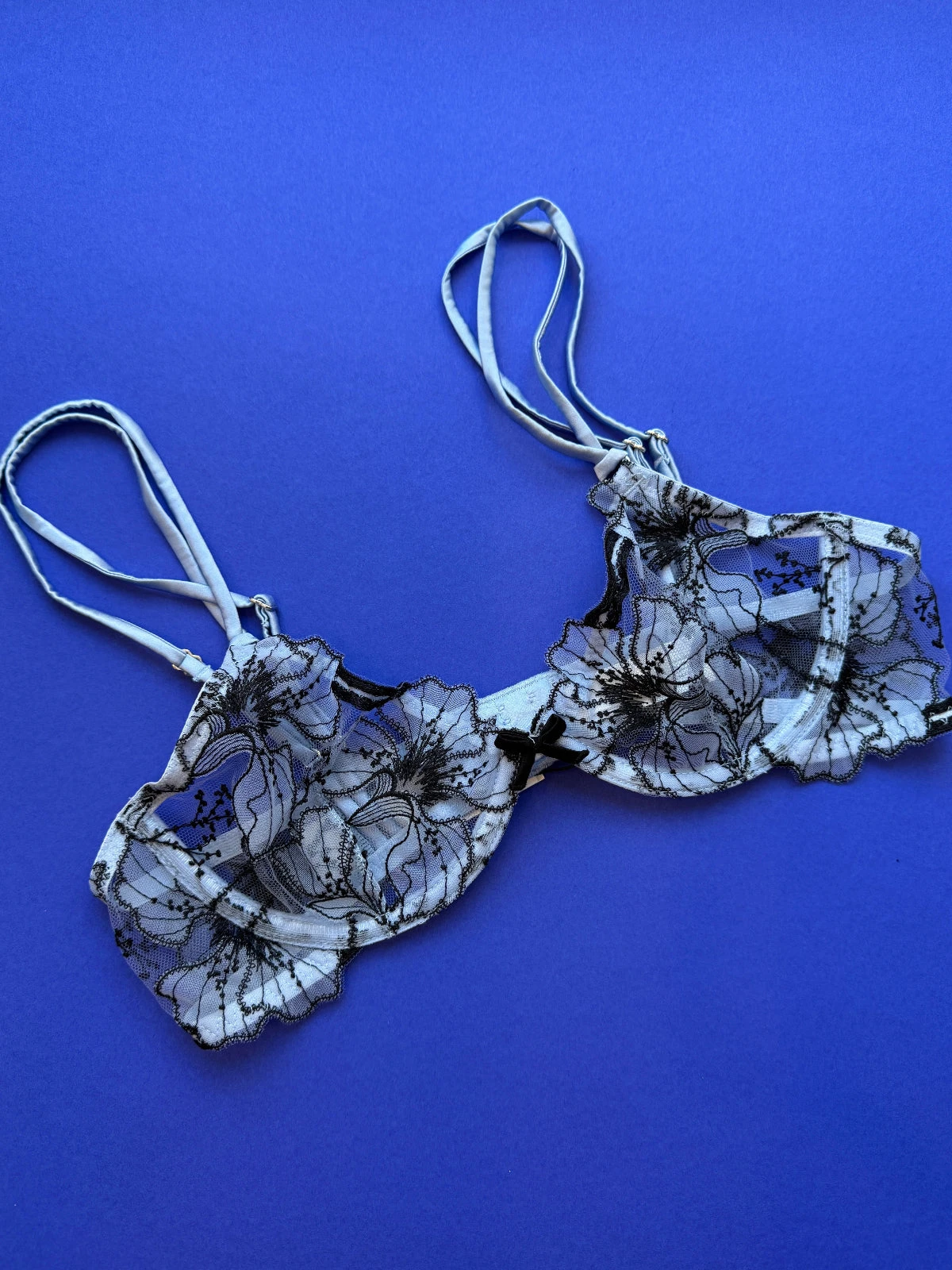 Romantic embroidered floral on crystal blue tulle cups. Plunging neckline with perfectly placed lace dancing along your decolletage. Features silk adjustable double straps and back hook & eye closure. Unlined.