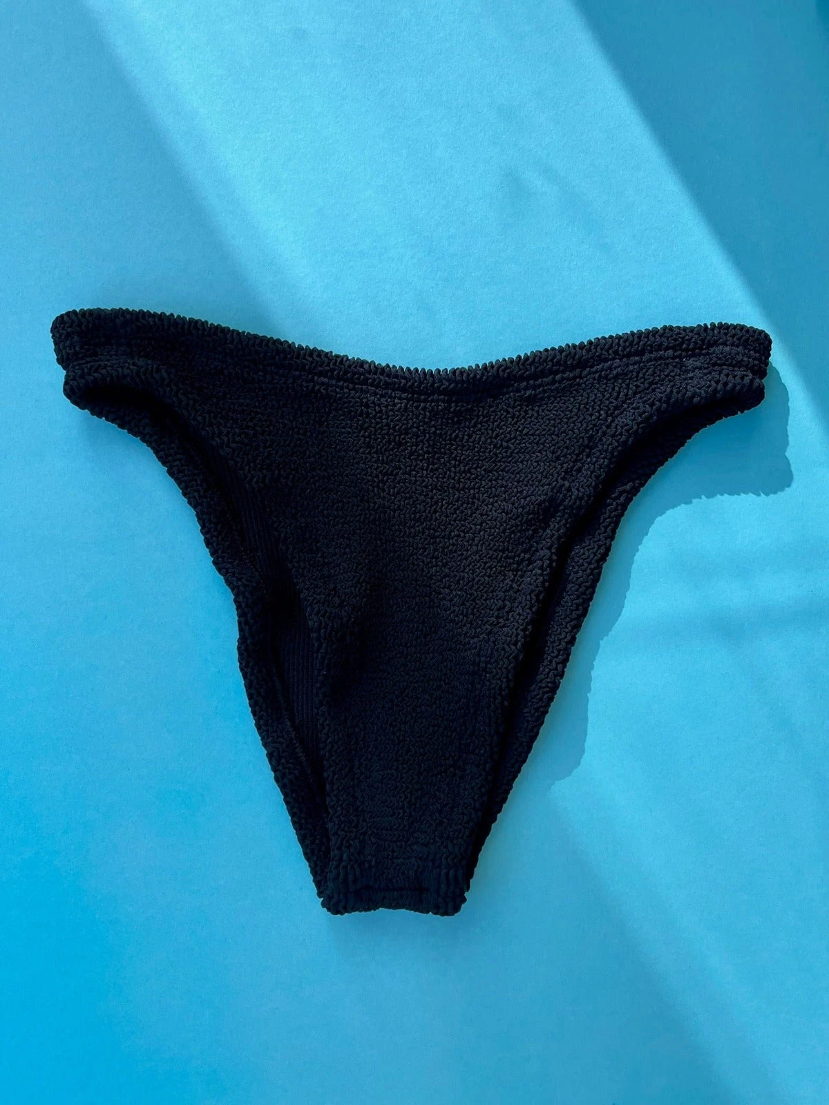 Pullover bikini top with skinny straps and straight across top. Comes with matching high-leg bikini bottoms.