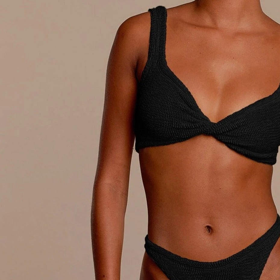 One of our best-selling styles from Hunza G. Dual strap top with with twist detailing in front, providing fuller chest support. Scoop back. Classic coverage bottoms, worn high or low rise.