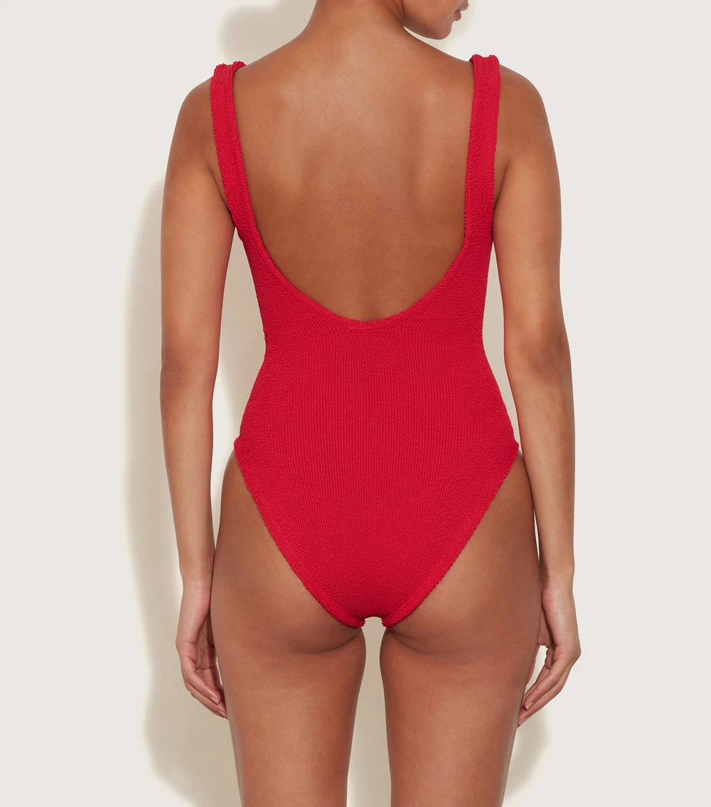 The classic Hunza G one piece now reworked in a siren red plunging one-piece in signature Hunza G crinkle fabric. Comfy, forgiving and super flattering. Rounded back. Wear the suit high on legs or pulled down depending on desired coverage – this is the beauty of the one size (fits lots!) fabric.