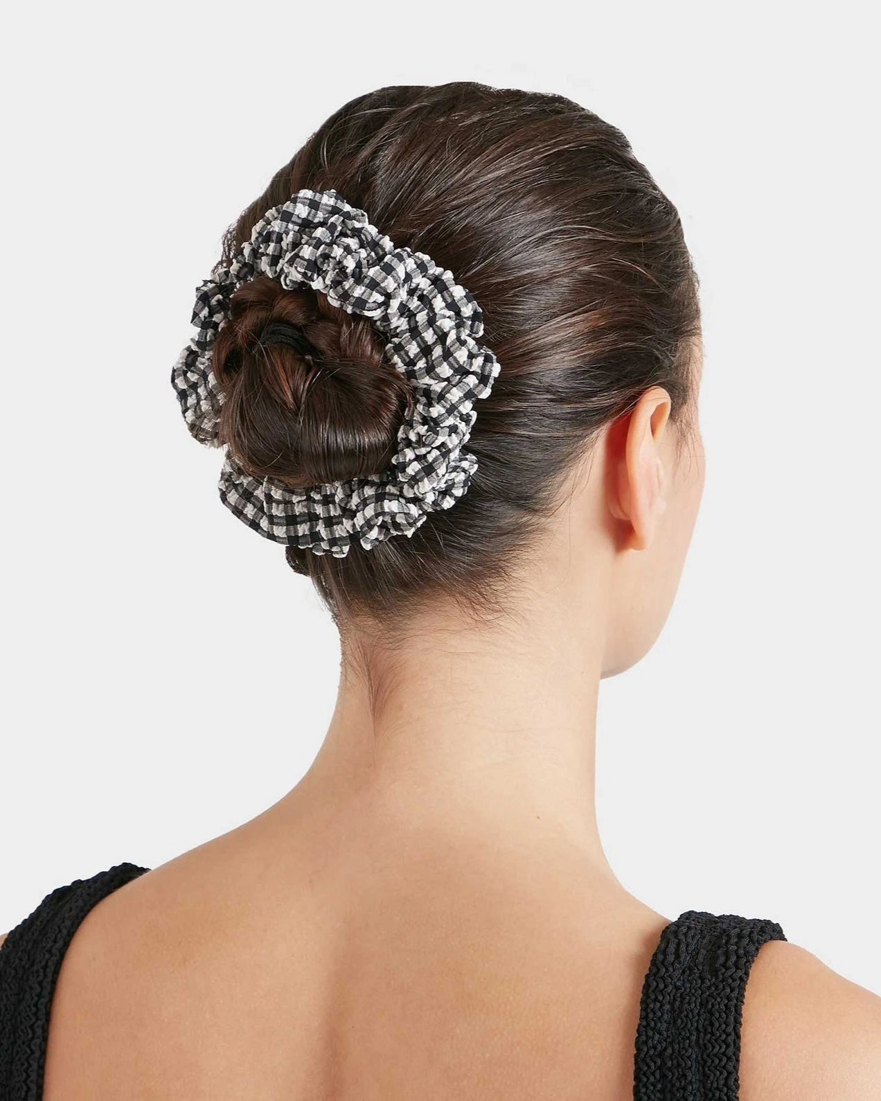Always a good idea to have a chic little scrunchie around your wrist. This wearable gingham cutie is meant to be worn in and out of the water.