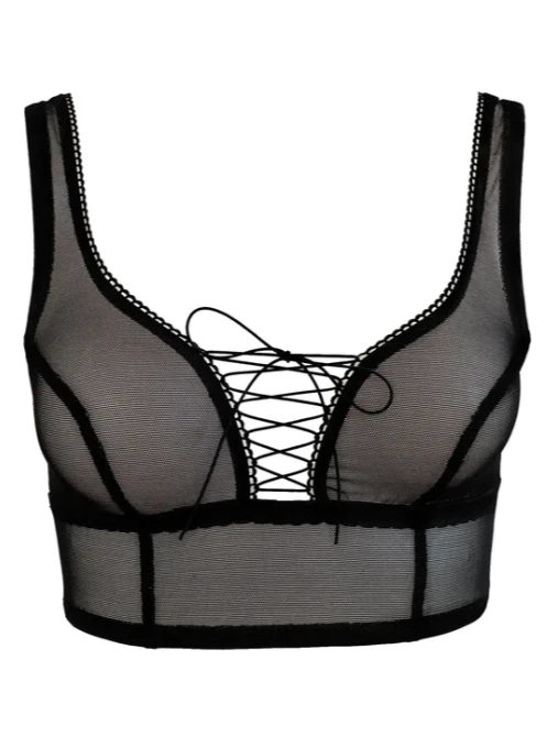A signature Kayleigh Peddie piece. This little sheer, crop top bra with front lacing evokes some smoky Renaissance affair. Make sure to wear it under a plunging neckline to show it off.