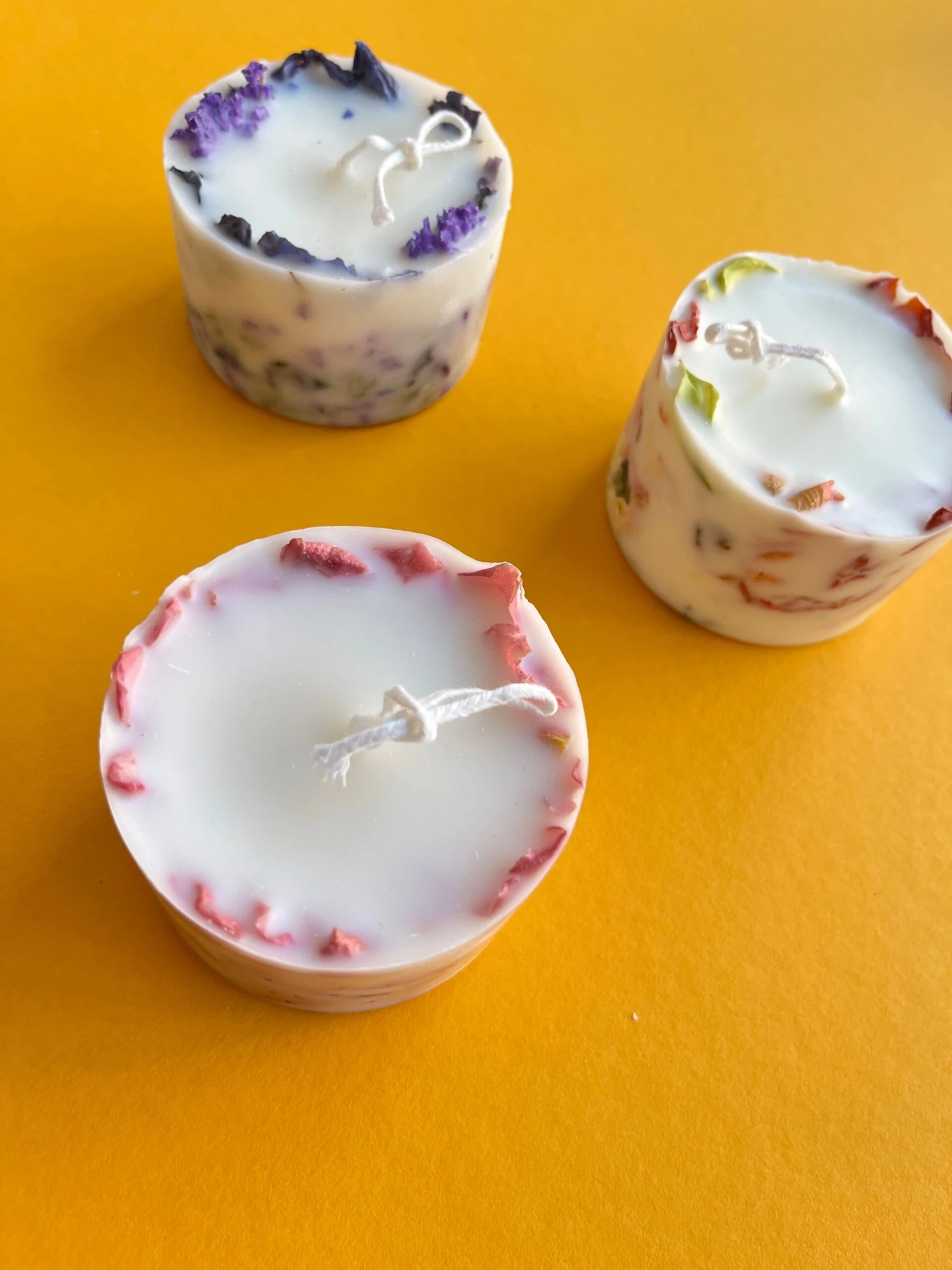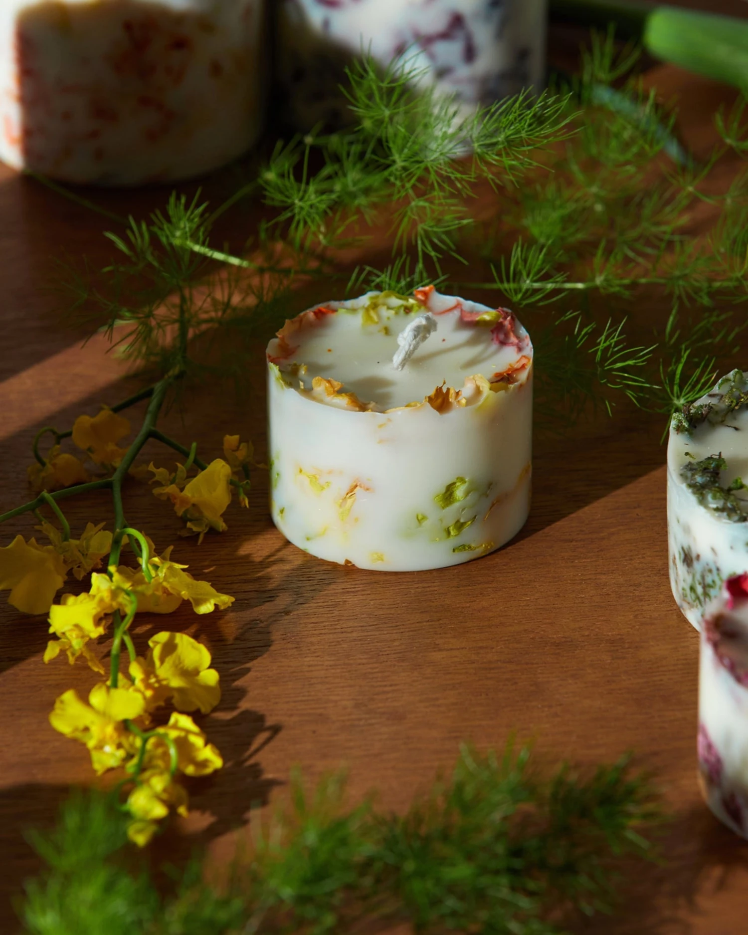 Made from dried flowers and leaves, 100% soy wax, 100% beeswax and blended with essential oils.