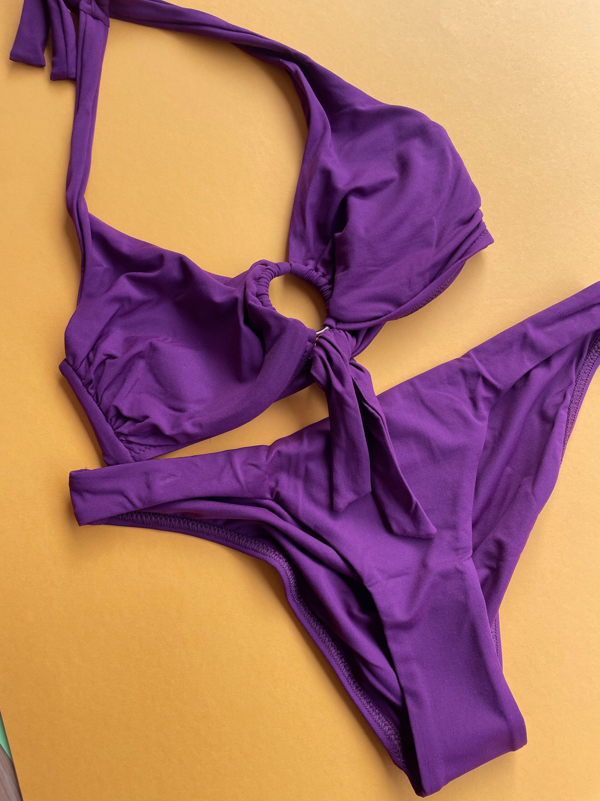 A best selling classic style for years, this halter top with hidden underwire is great for our bustier ladies. Gold ring in center.