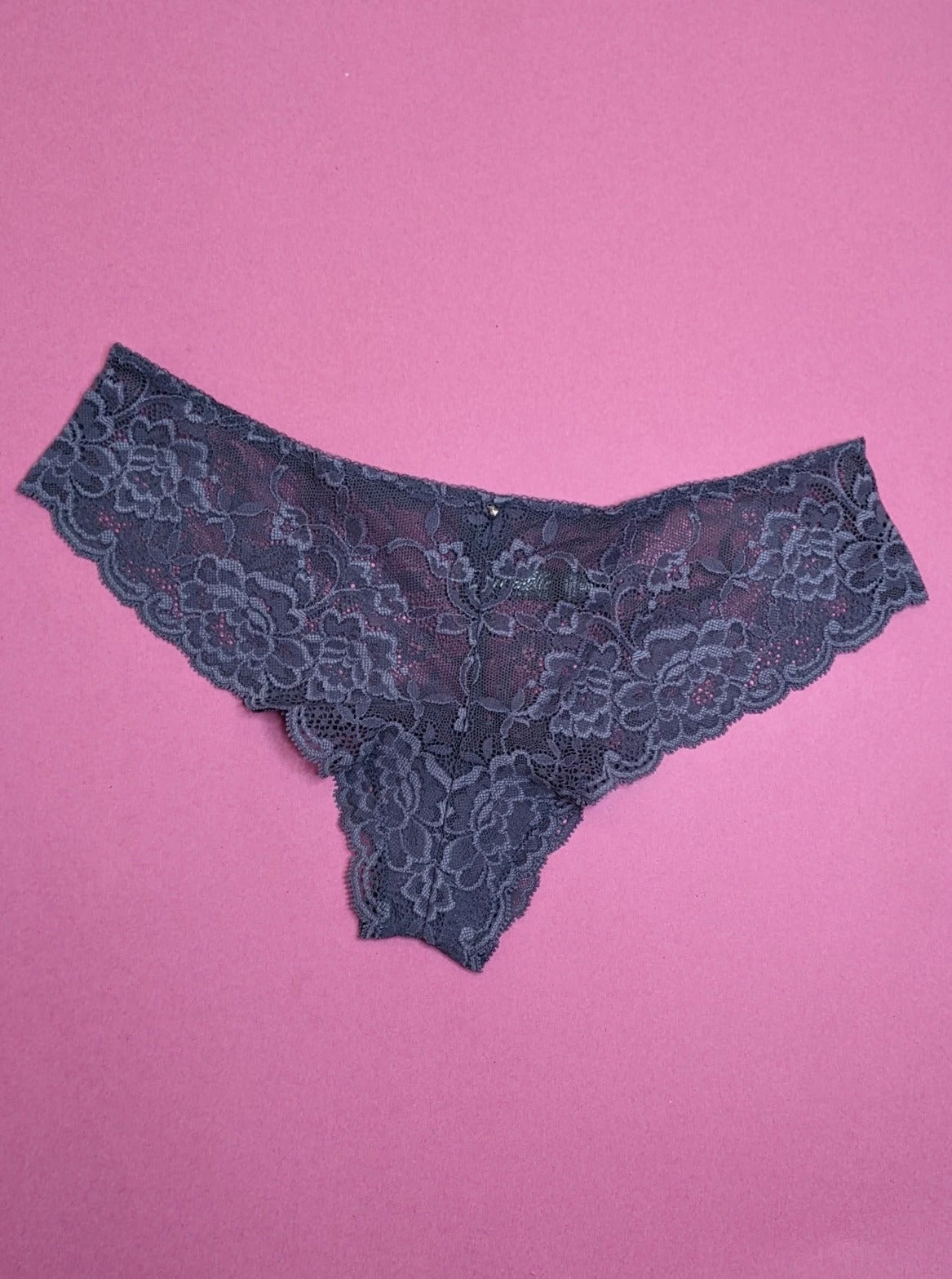 This pair of low rise, cheeky panties by Montelle are rendered in graphic stretch lace. Minimal coverage, with a small rhinestone charm at the front of the panties.