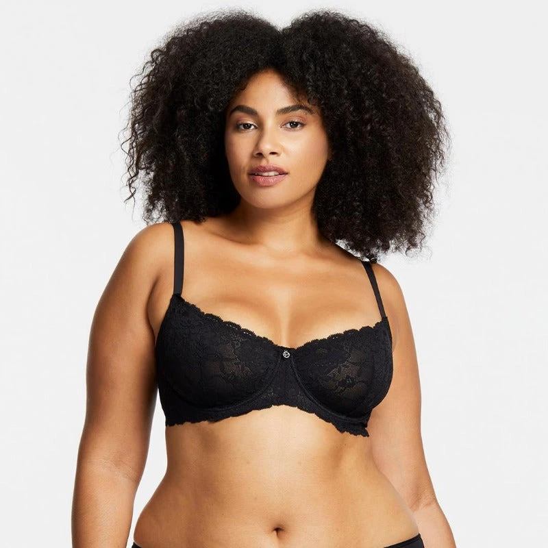 This demi cup bra by Montelle is rendered in a pretty floral stretch lace. Underwire with thick elastic straps for support. The fuller cups (some E, F, and G cups) come in a four-part construction with more coverage.