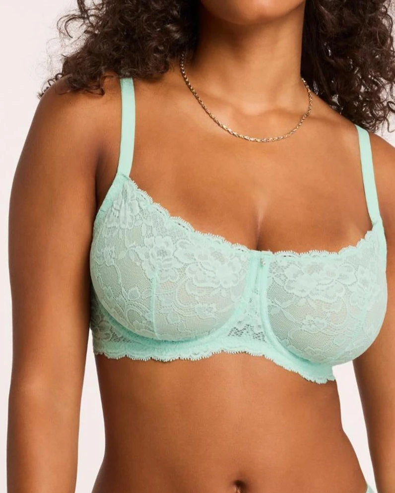 This demi cup bra by Montelle is rendered in a pretty floral stretch lace. Underwire with thick elastic straps for support.