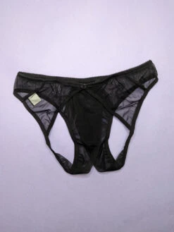 The perfect ouvert! Perfectly placed cutouts in the back and at the bottom guarantee a good time. Cut from the same Italian mesh as the Whisper collection, the mesh is double layered in the front “curtains” and held together in the back with a tiny rose-gold tinted o ring.