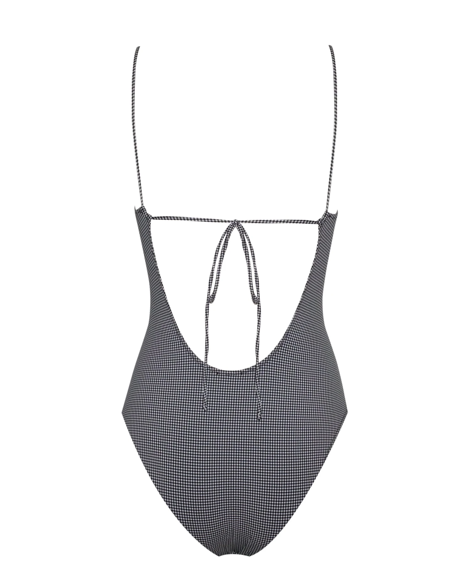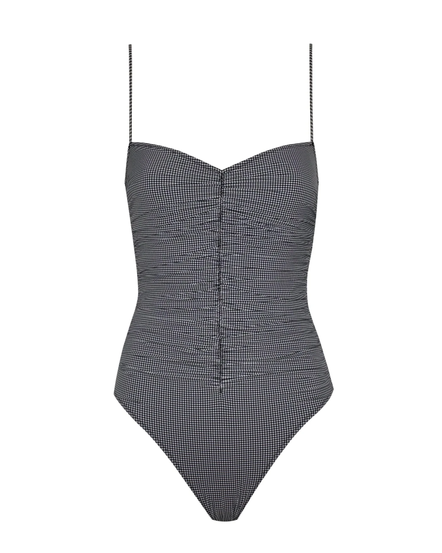 Lovely ruched front v-neck one piece. Features delicate straps, a low back, adjustable back tie and medium bum coverage.