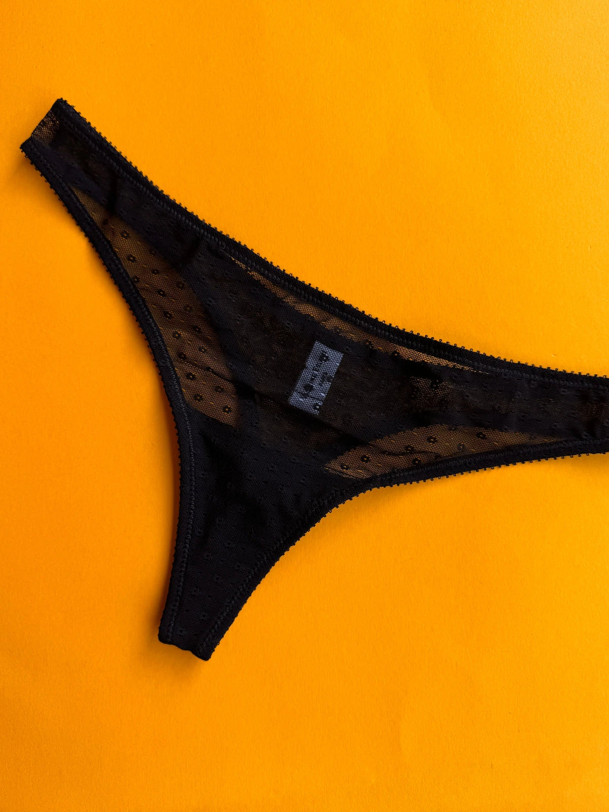 Flattering low cut thong made in fine tulle with a delicate flower pattern. Evokes the sex appeal and ease of the 70s.